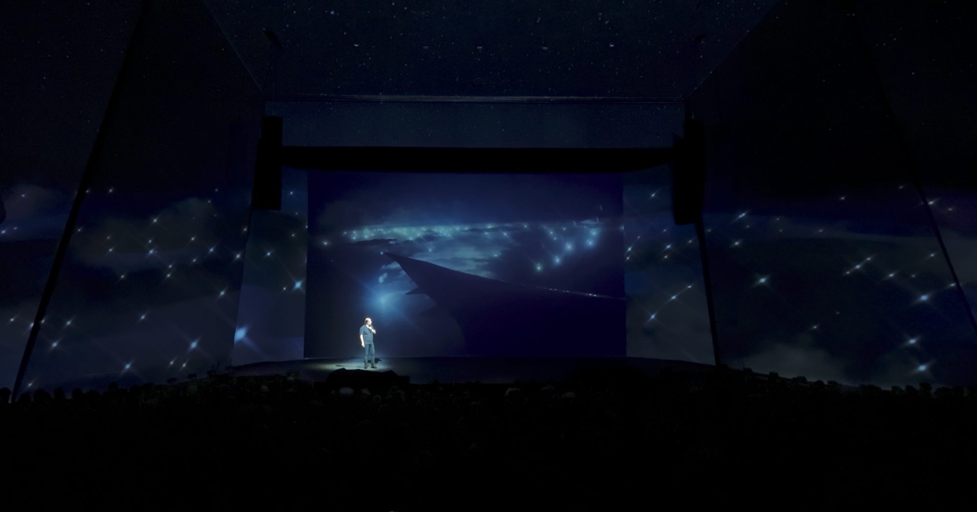 La innovadora puesta en escena incluye la recreación de una cabina en escala real de un Boeing 707 y un juego de proyecciones envolventes de alta resolución que sumergen al espectador en una experiencia inmersiva donde teatro y cine se fusionan.